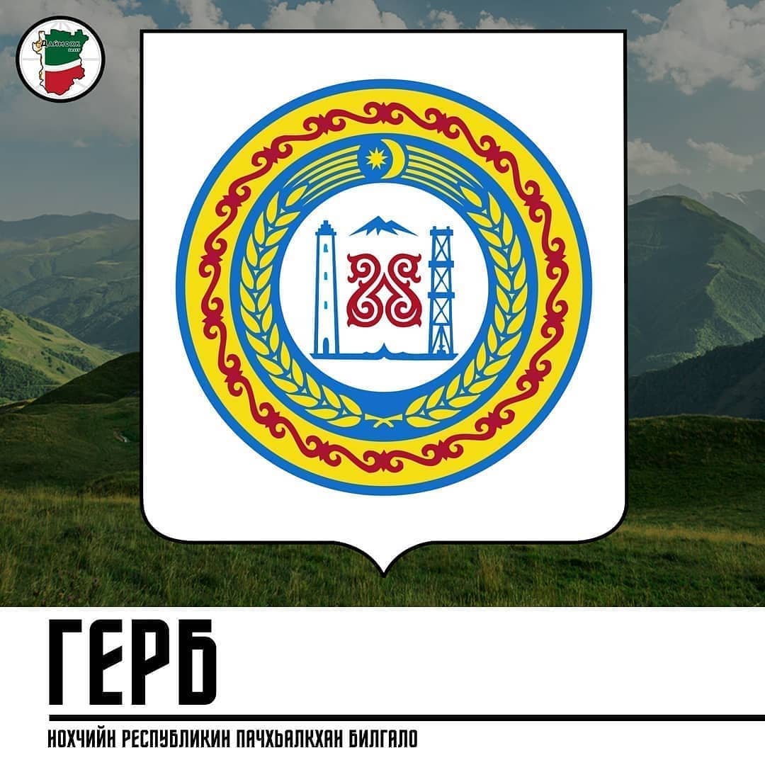 НОХЧИЙН РЕСПУБЛИКИН ПАЧХЬАЛКХАН ГЕРБ⠀Карарчу шарахь тIаьххьара бинчу хийцамашца а догIуш, гонаха геральдикин турс а долуш ю иза [герб]:⠀
